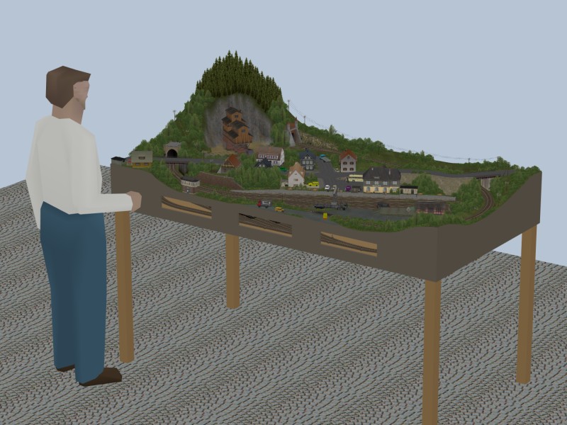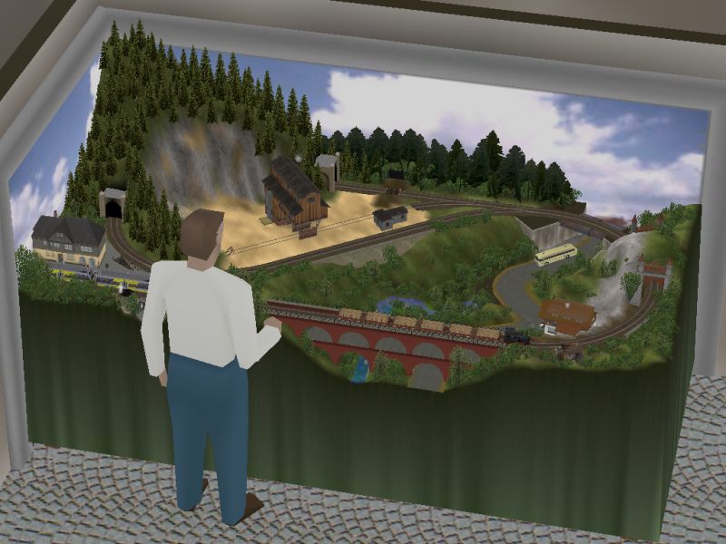 Dargestellt ist ein zweigleisiges etwas verschlungenes Gleisoval mit viergleisigem Bahnhof, zweigleisigem Güterbereich und zweigleisigem Lokschuppen. Darauf fahren vollautomatisch sechs Züge, wobei einer ab und zu die Lok wechselt.