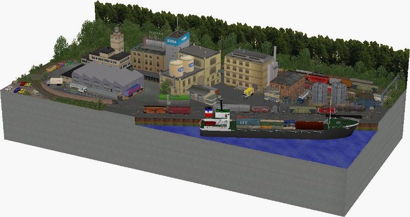 Die Anlage besteht aus einem durchgehendem Hauptgleis, an dem eine Wagenübergabestelle und eine kleine Hafenbahn angeschlossen ist. Der Betrieb der Anlage läuft vollautomatisch, wer will, kann jedoch den Rangierbetrieb am Hafen übernehmen. Näheres dazu steht in der beigefügten PDF-Beschreibung.