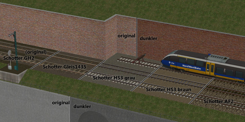 Ebenfalls oft nachgefragt wurden andere Schotter-Texturen für den Abdeckungsspline. Ich habe nun neben der Orignaltextur, die zu den Betonmauern von GH2 passt, vier weitere passende Textur-Varianten gemacht, die zu der Gleis1435_DR-Serie, den HS3-Gleisen mit unregelmäßiger Schotterkante mit grauem und braunem Schotter sowie zum Weichensystem von AF2 passen. Die erstgenannten Texturen sind lediglich farblich an die Splines angepasst, von AF2 habe ich die Erlaubnis erhalten, die Originaltextur zu verwenden.