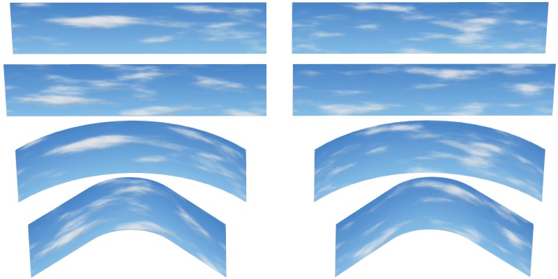 Das Set enthält vier verschiedene Kulissen mit unterschiedlichen Wolkenmustern, die in beliebiger Reihenfolge nahtlos aneinandergereiht werden können. Jede Kulisse ist standardmäßig 100m lang und 25m hoch. Wenn das zu klein ist, können die Kulissen aber auch ganz leicht größerskaliert werden.
