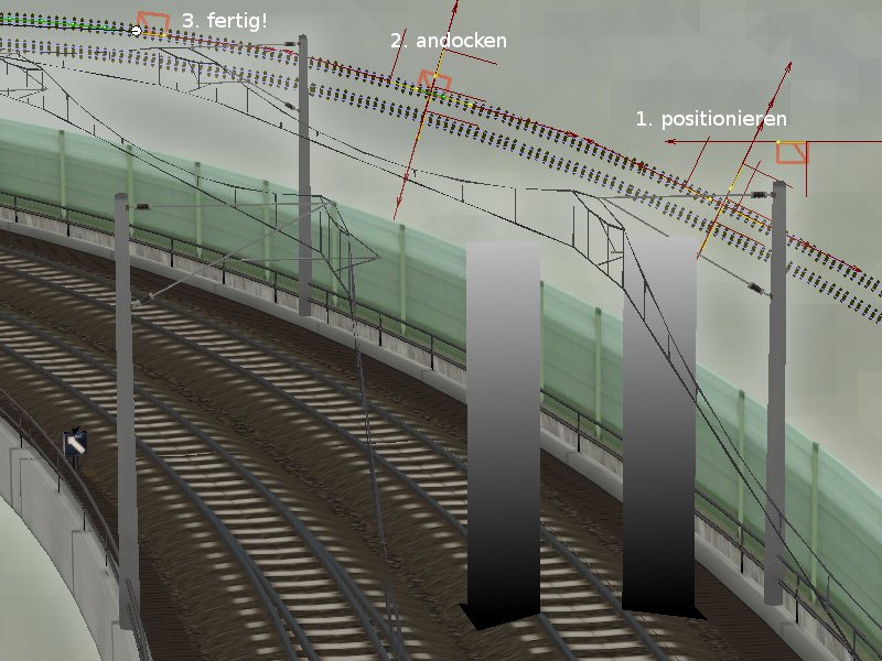 Mit dem Update vom 20.01.2012 wurde noch eine Möglichkeit geschaffen, die Lage der Oberleitung zu überprüfen. Durch das Update vom 24.07.2021 wird der Mastensetzer nach oben verlängert, sodass die Positionierung von Quertragwerken vereinfacht wird. (Das Bild zeigt noch die ursprüngliche Version)