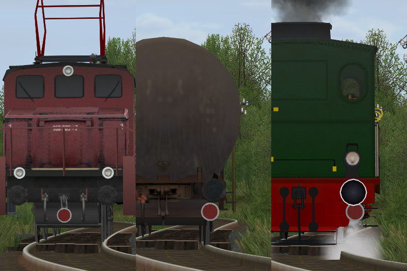 Die Rollmaterialien lassen sich einfach von hinten an jeden Zug ankuppeln (dabei sollte der Knubbel im Radarfenster zum Zug zeigen). Bei den drei letztgenannten Rollis ist die Zugschlussscheibe bereits fest positioniert, sodass sie nach dem Ankuppeln ohne Fummelei in einer vorbildgerechten Lage hängt.