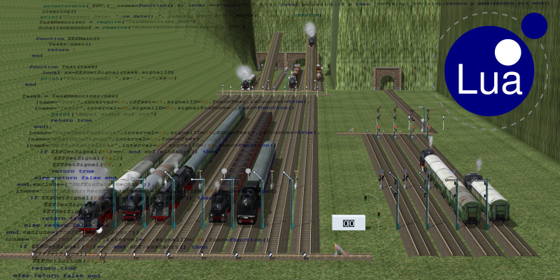Das Zählersignal (sofern installiert) und die Ampel zwischen den beiden Schattenbahnhöfen sind die Statussignale von zwei TaskMemorizer-Einträgen zu Test- und Veranschaulichungszwecken. Werden sie per Shift+Klick umgestellt, erscheint (nach einiger Zeit) ein Text im Lua-Ereignisfenster.